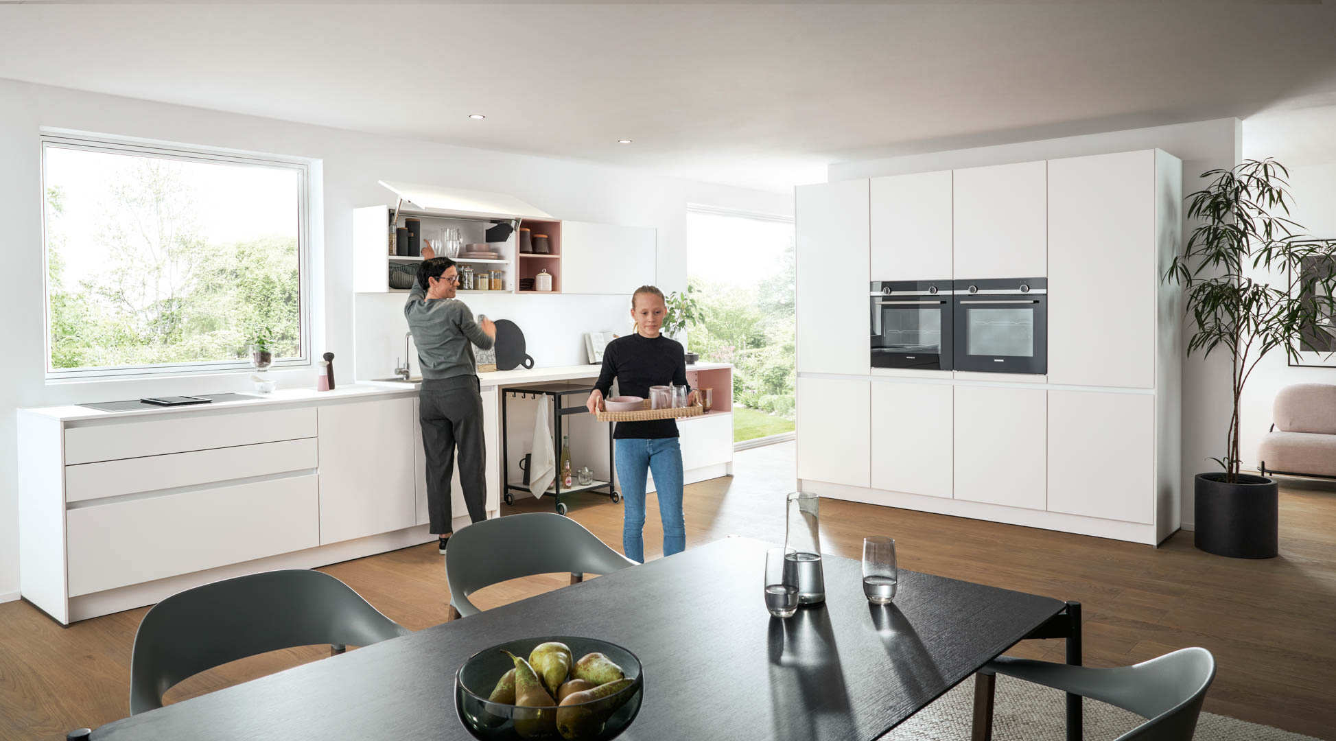 Mit klarer Formensprache vereint Contur® Küche 56.210 geradliniges Design mit vielfältigen Funktionen. Die extrabreiten Auszüge und die grifflose Frontoptikgeben der Designerküche den letzten Schliff. Genügend Aufbewahrungsfläche in Ober- und Hochschränken für kleine und große Utensilien. Die Zartrosa samtmatten Regalelemente schenken als farbige Nuance der cleanen Küchengestaltung den individuellen Look. Der Muldenlüfter im Kochfeld schenkt freie Sicht und hilft beider Geruchsnehmung. Gleich zwei hocheingebaute Backöfen geben Freiheit für unterschiedliche Temperaturwahl.